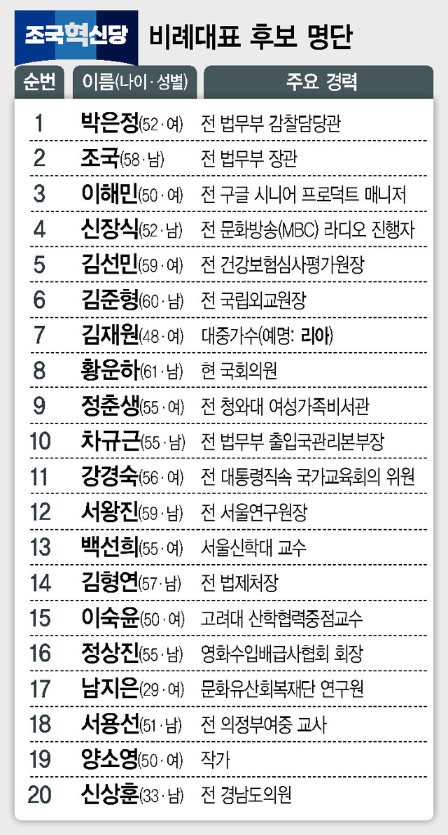 조국혁신당 비례대표 후보 명단 20명 순번