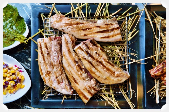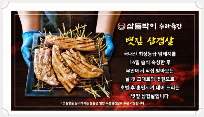 삼돌박이의 대표 메뉴로서 선별된 암퇘지 삼겹살을 14일 웻에이징 숙성하여 참숯 초벌후 볏짚 훈연하여 내어드리는 상품입니다 흉내만 내는 초벌집들과 달리 볏짚 특유의 진한향이 일품입니