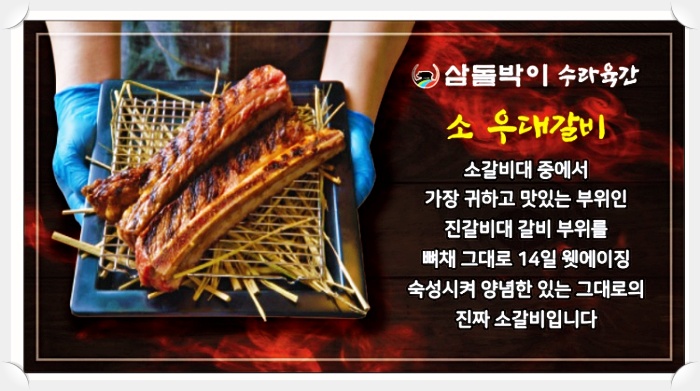 삼돌박이의 대표 메뉴로서 소 짝갈비중 가장 고급부위인 진갈비살의 갈비만을 추려내서 14일 웻에이징 숙성후 양념한후 참숯에 초벌해 볏짚에 훈연하여 내어드리는 상품입니다